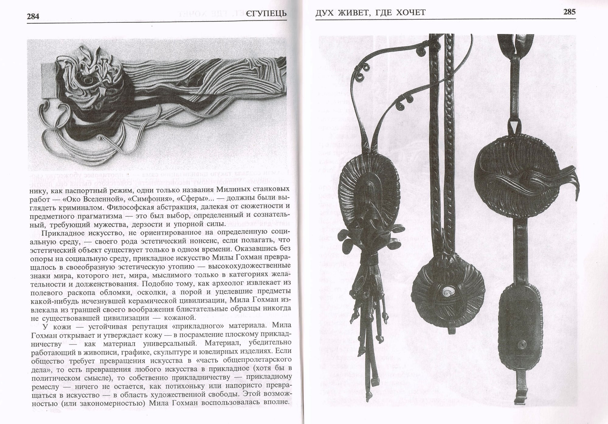 " She was a pioneer-discoverer of a number of directions in artistic leather processing, which today seem natural to us. The artist made a fundamentally new language, not borrowed from anyone, and developed a range of things that spoke this language. In addition to the usual exquisite leather utensils (cases, book covers), in addition to the usual leather bags and belts, Mila Gokhman came up with elegant jewelry: bracelets, pendants, brooches, rings. Not satisfied with this, she tried to reveal the decorative possibilities of leather in the panel, the unusualness of which can be compared only with their complexity. The composer works with tender attentiveness to every small piece of skin, every bend, every shade of color. And this attitude, not the value of the material, turns her work into a jewel." V. Volpina